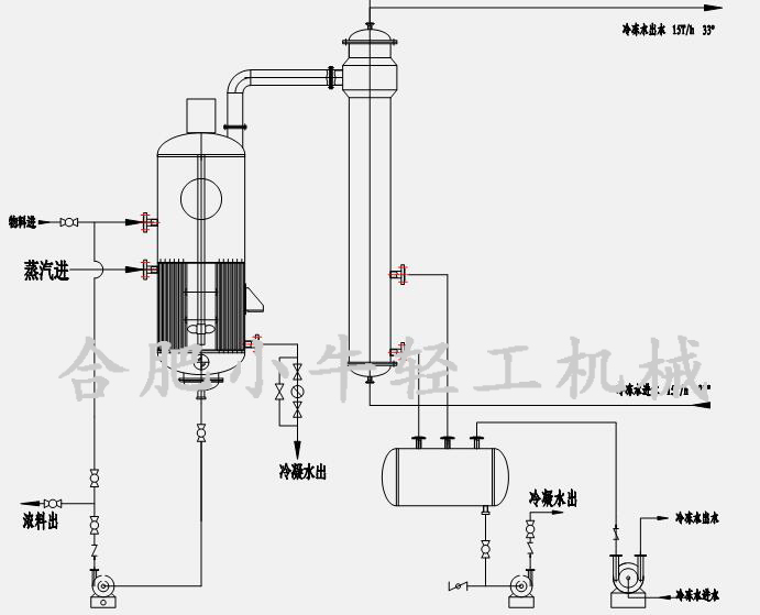 中央循環(huán)管式蒸發(fā)器在蒸發(fā)室外壁有視鏡、人孔、儀表、取樣等裝置。在頂部有捕集器裝置,主要使二次蒸汽可能夾帶的汁液進(jìn)行分離,保證二次蒸汽的潔凈,有利于提高次一效濃縮鍋的傳熱效果,也減少料液的損失,頂部與二次蒸汽排出管相連。