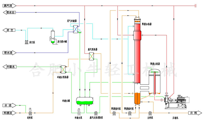 降膜蒸發(fā)器的料液是從蒸發(fā)器的頂部加入,在重力作用下沿管壁成膜狀下降,并在通過(guò)加熱管的過(guò)程中被蒸發(fā)增濃,在其底部得到濃縮液。MVR降膜蒸發(fā)器將加熱器的產(chǎn)生的二次蒸汽通過(guò)壓縮機(jī)的絕熱壓縮,能量進(jìn)行壓縮提升,使其壓力、溫度提高后,再作為加熱蒸汽送入蒸發(fā)器的加熱室,冷凝放熱,使其對(duì)這壓縮過(guò)后的二次蒸汽加以利用,將其二次蒸汽內(nèi)部潛熱進(jìn)行回收。因二次蒸汽的潛熱得到了回收利用,所以該設(shè)備具有節(jié)省能耗的顯著特點(diǎn)。